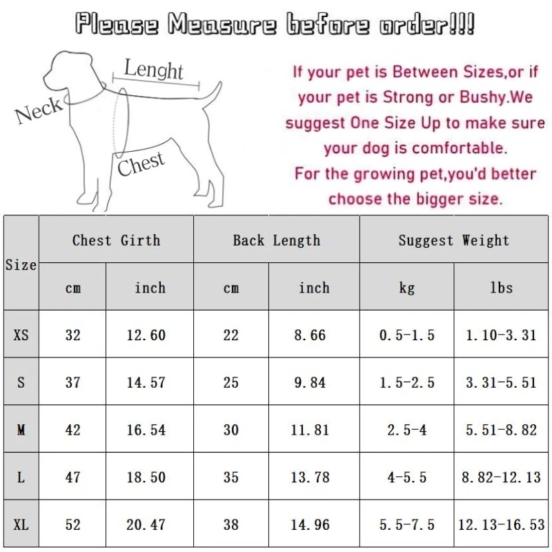 XL Chest Girth 52cm/20.47” Back Length 38cm/14.96” Suggest Weight 5.5-7.5kg/12.13-16.53 lbs