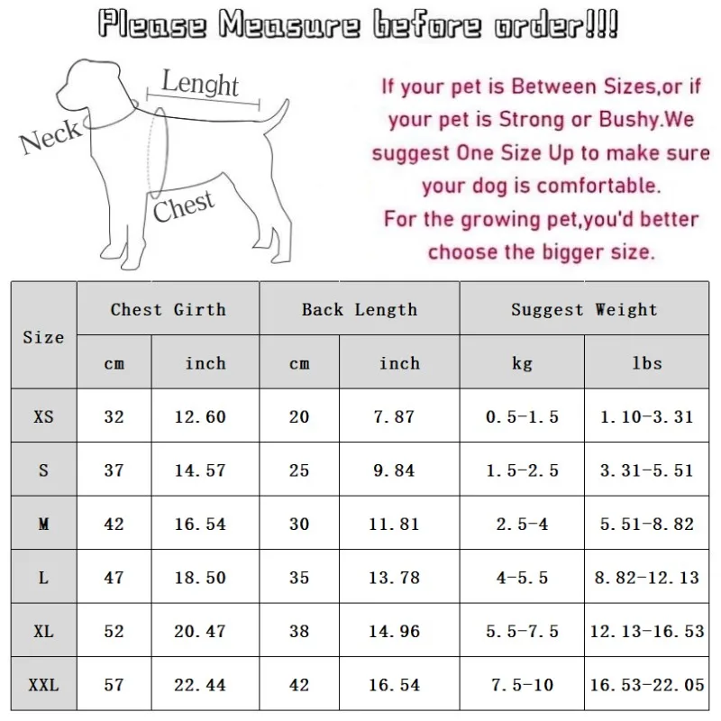 XL Chest Girth 52cm/20.47” Back Length 38cm/14.96” Suggest Weight 5.5-7.5kg/12.13-16.53 lbs