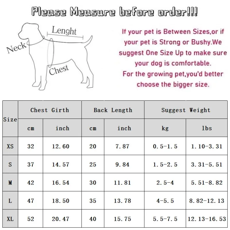 XL Chest Girth 52cm/20.47” Back Length 40cm/15.75” Suggest Weight 5.5-7.5kg/12.13-16.53 lbs