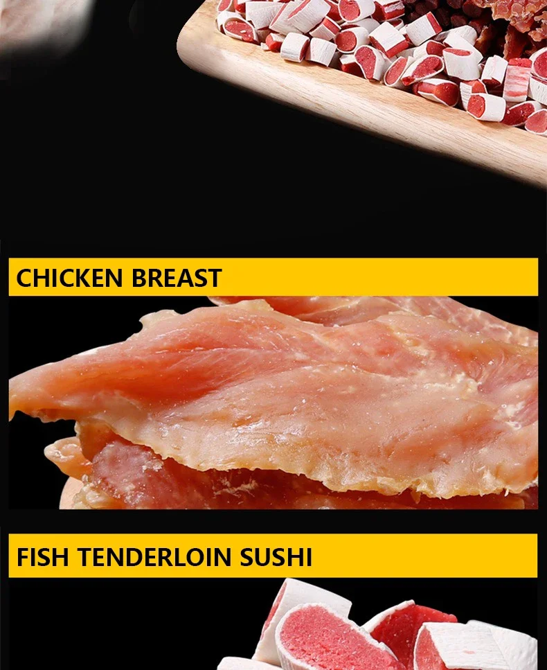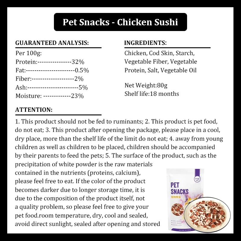 Sushi: Chicken, Cod Skin, Starch, Vegetable Fiber, Vegetable Fiber, Vegetable Protein, Salt, Vegetable Oil