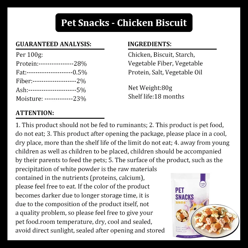 Cookies: Chicken, Cookies, Starch, Vegetable Fiber, Vegetable Protein, Salt, Vegetable Oil