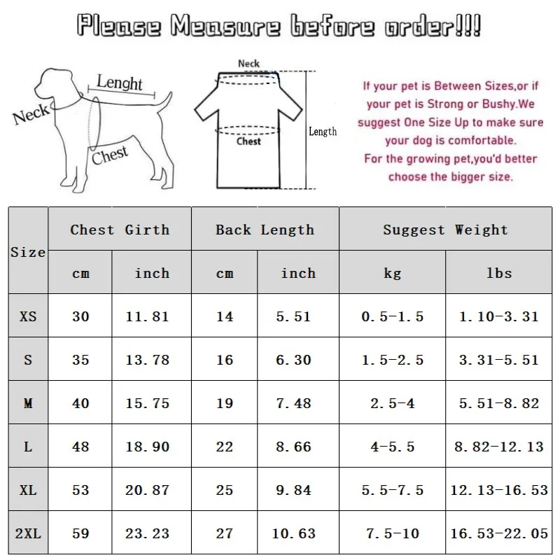 2XL: Chest 59cm/23.23” ; Length 27cm/10.63” ;Suggest Weight 7.5-10 kg/16.53-22.05 lbs.